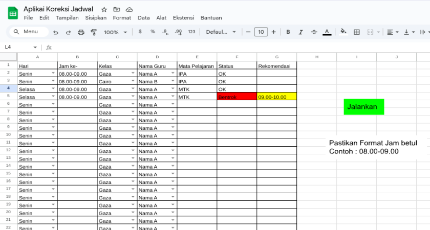 1. Input Data Awal: Masukkan data jadwal awal ke dalam aplikasi, termasuk hari, jam, kelas, nama guru, dan mata pelajaran.