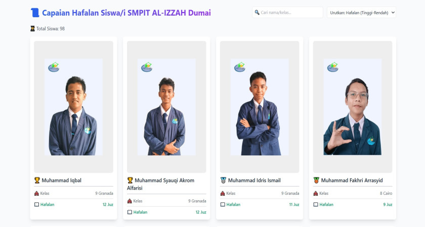 Dalam rangka mendukung visi dan misi sekolah dalam mencetak generasi Qur'ani yang unggul, SMPIT AL-IZZAH Dumai memperkenalkan Dashboard Digital Pemantauan Capaian Hafalan Siswa . Inovasi ini merupakan langkah maju dalam mengintegrasikan teknologi ke dalam proses pembelajaran, khususnya dalam program tahfidz Al-Qur'an.